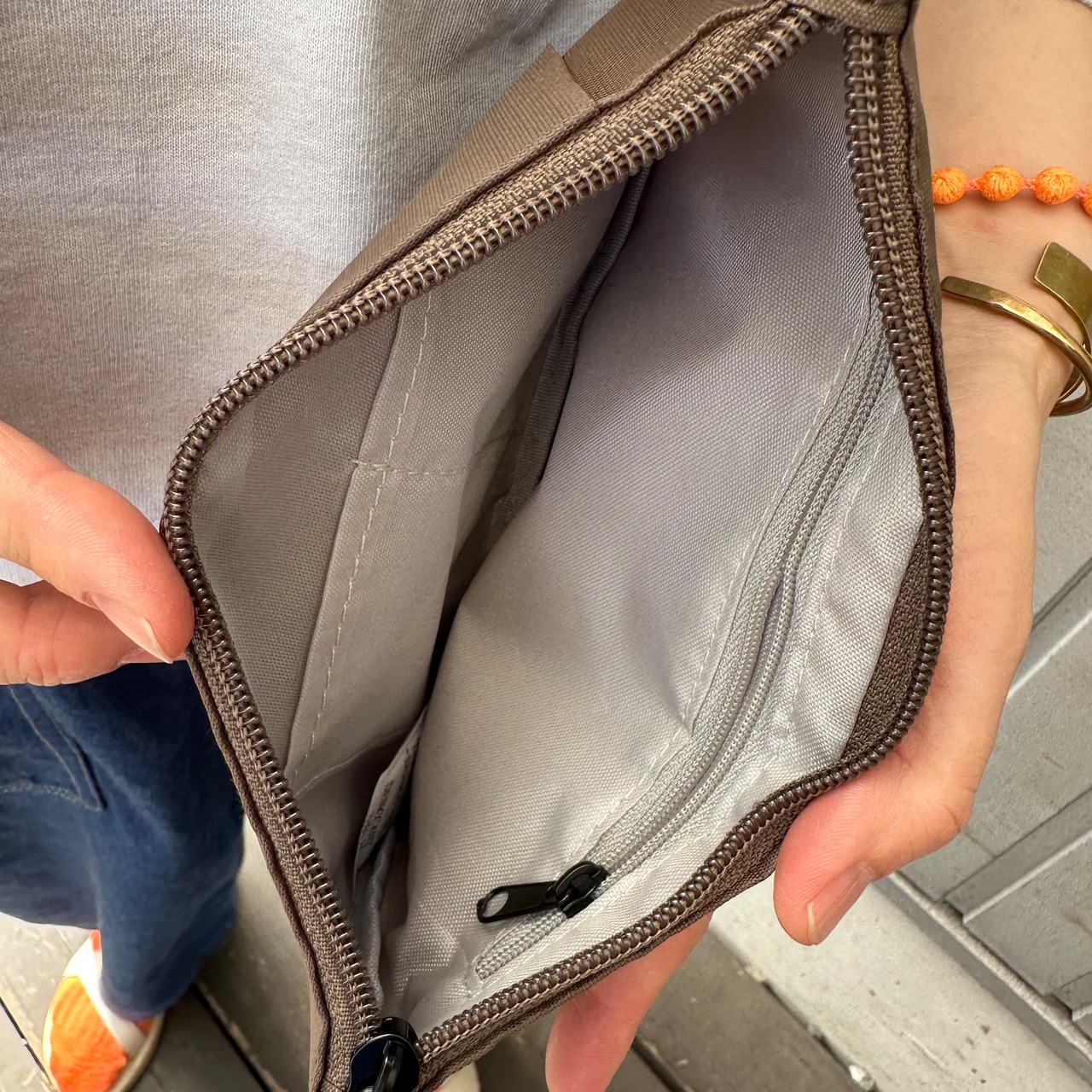スマホをしっかりホールドしながら簡単に出し入れできるポケットや鍵などの無くしたくない小物はジップ付きポケットへ。