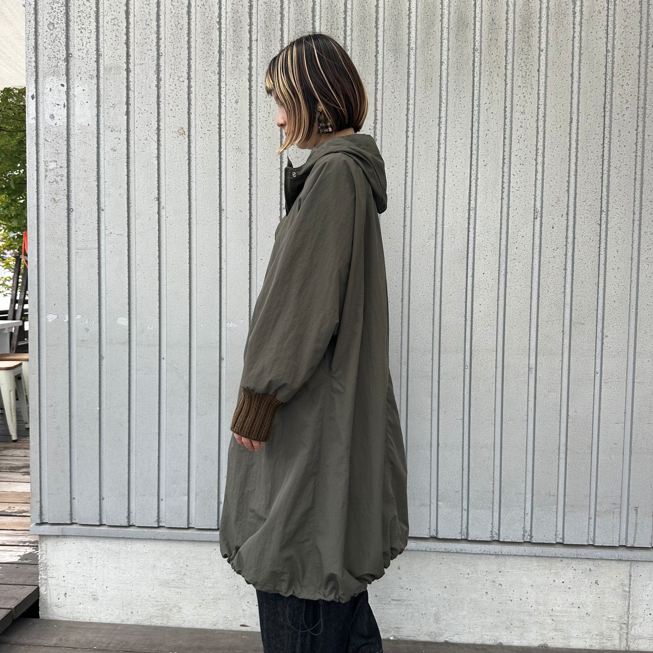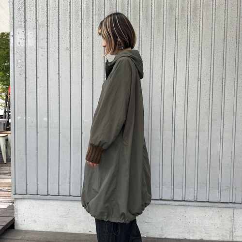 ナイロンを高密度に洗い晒したようなシボ感がありマットなウェザーとローゲージの糸でざっく編んだニットのリブを付けた、テントラインオーバーサイズのマウンテンジャケット