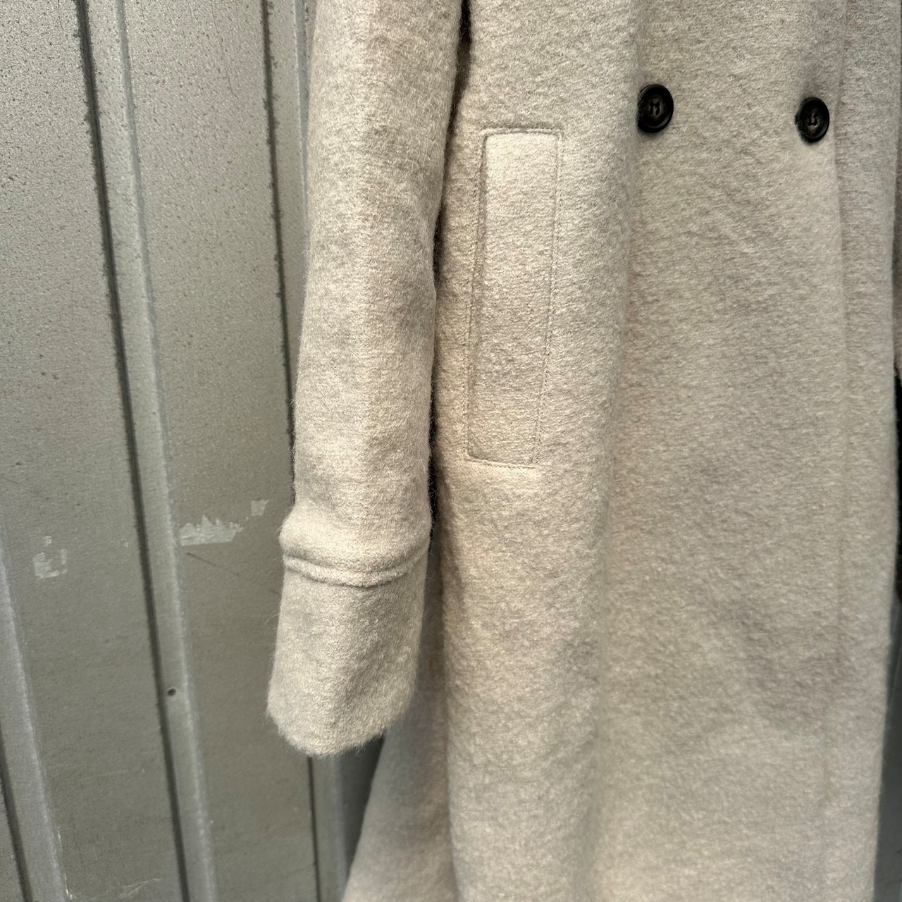 ウールの繊維の隙間と隙間をぎゅぎゅぎゅっと詰め圧縮させた生地を使用したダブルボタンロング丈フーディーコートです。原点回帰!SIMPLE IS THE BEST!ゆったりとした身幅に裾周りは少しシュッとコンパクトに!立ち上がりのきれいさにこだわったフード部分。首元をあったかく包み込んでくれますよ!ダブルボタンの仕様ですが、野暮ったく子供っぽく見えないようにシルエットにこだわった一枚です!とにかく軽いのが嬉しい!
