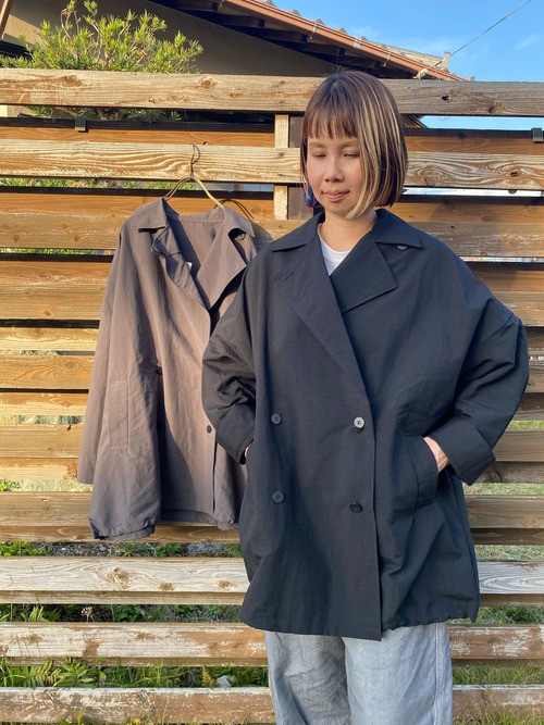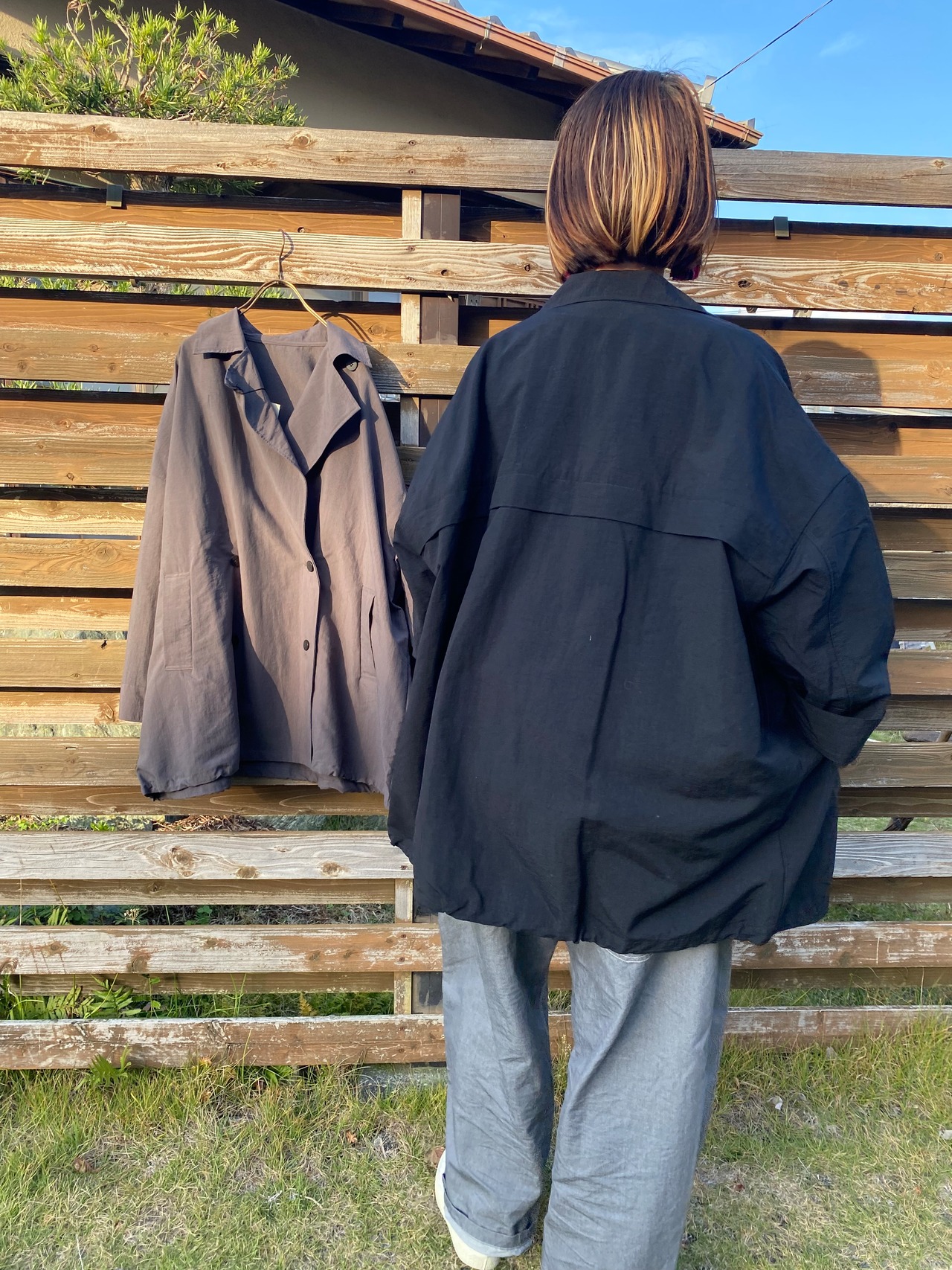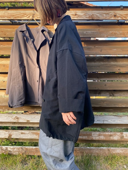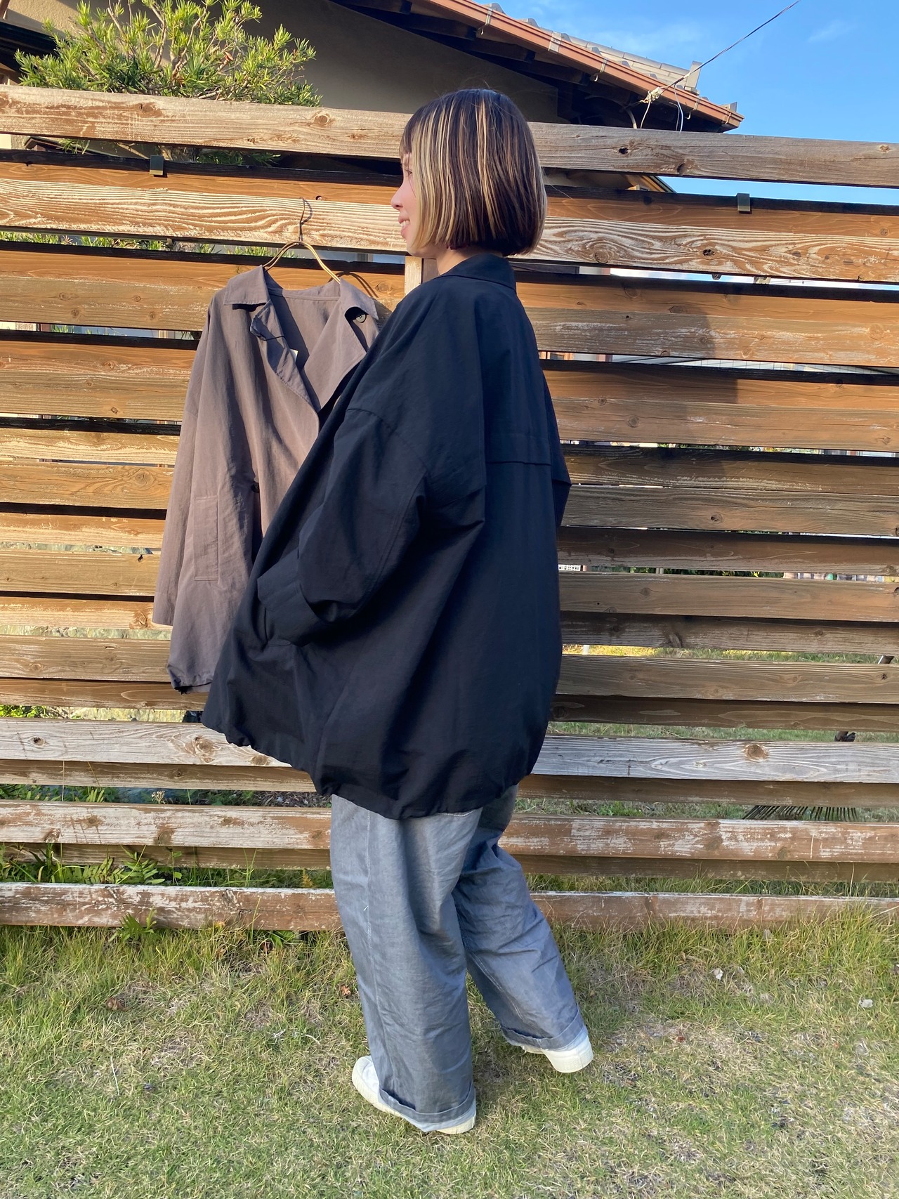 裾のドローコードでバルーンシルエットにできたり、袖をロールアップして抜け感を出したり、ボタンを外して肩を抜いたり、様々な着方が楽しめるアウターです