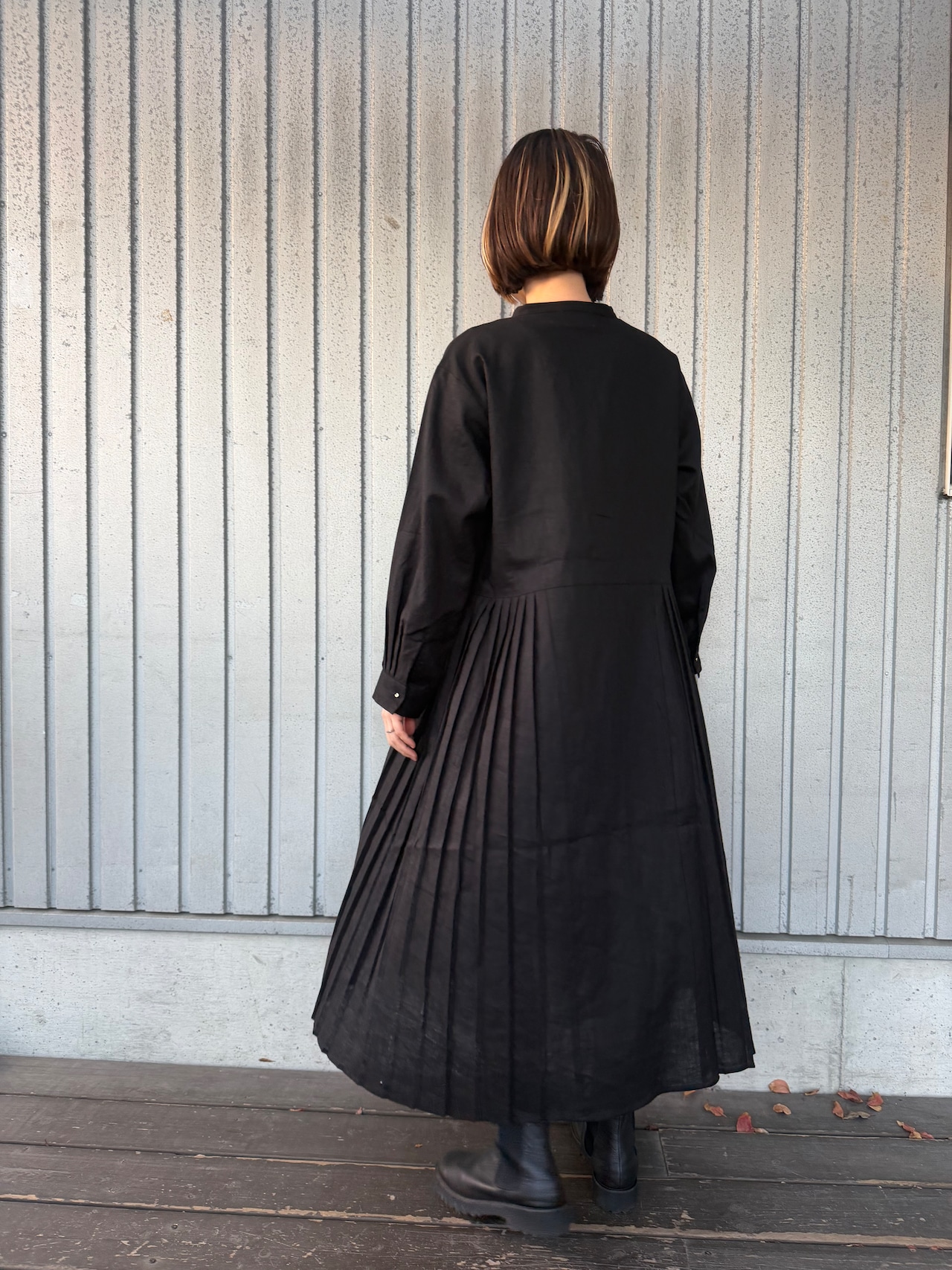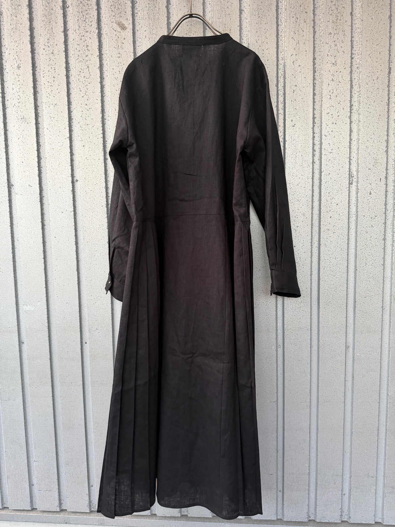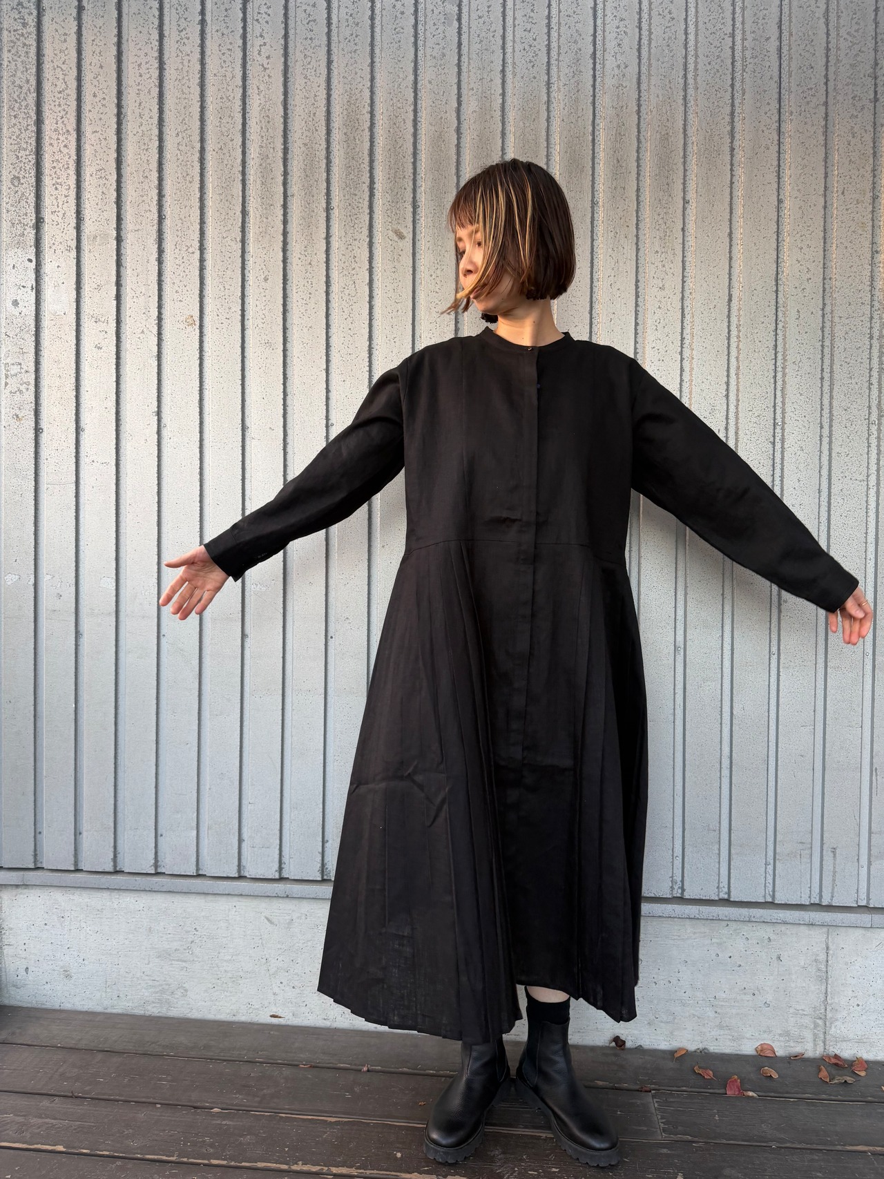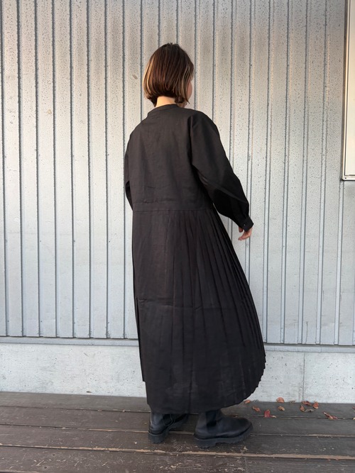 リネン100%のサイドプリーツのワンピース