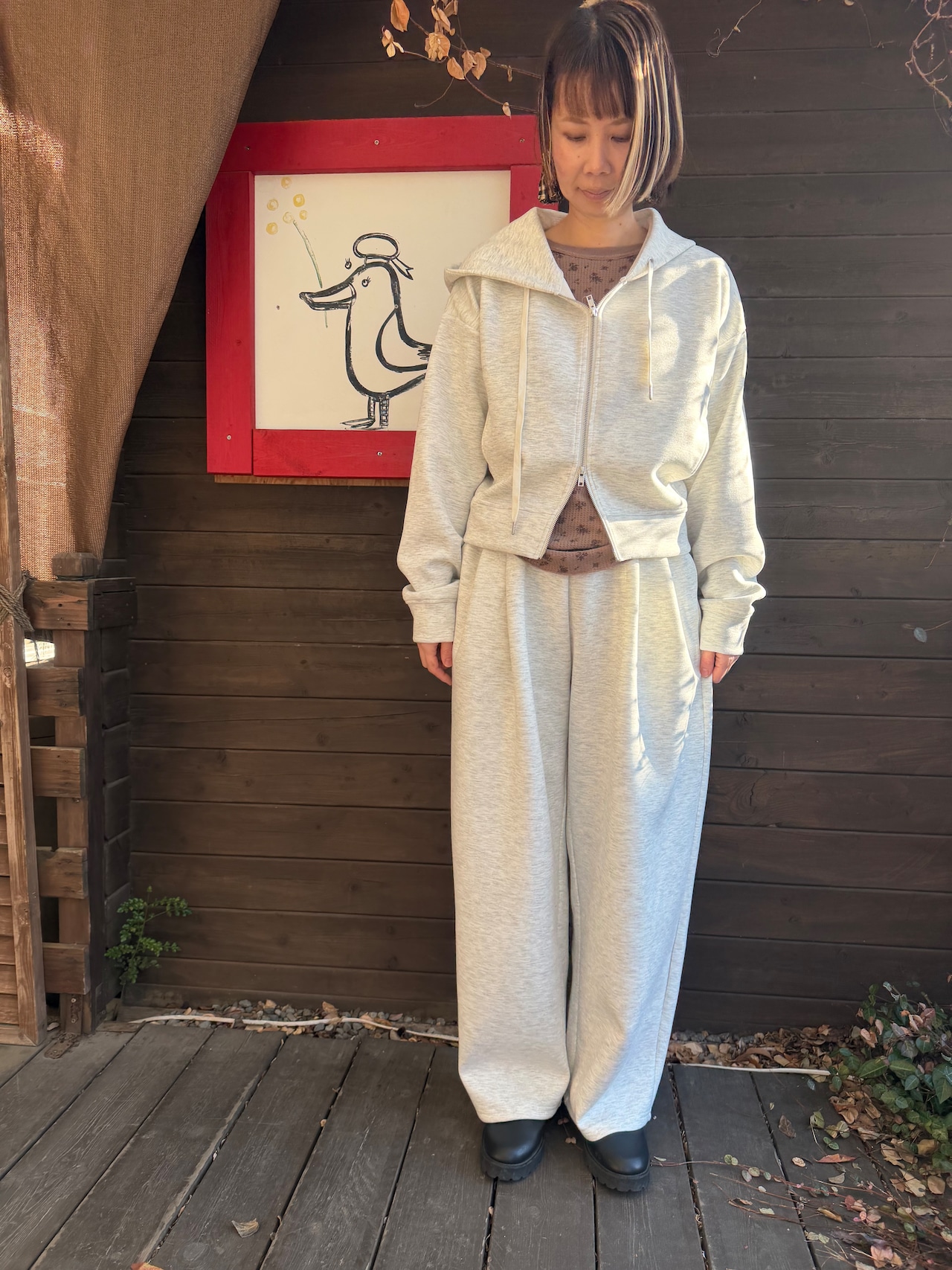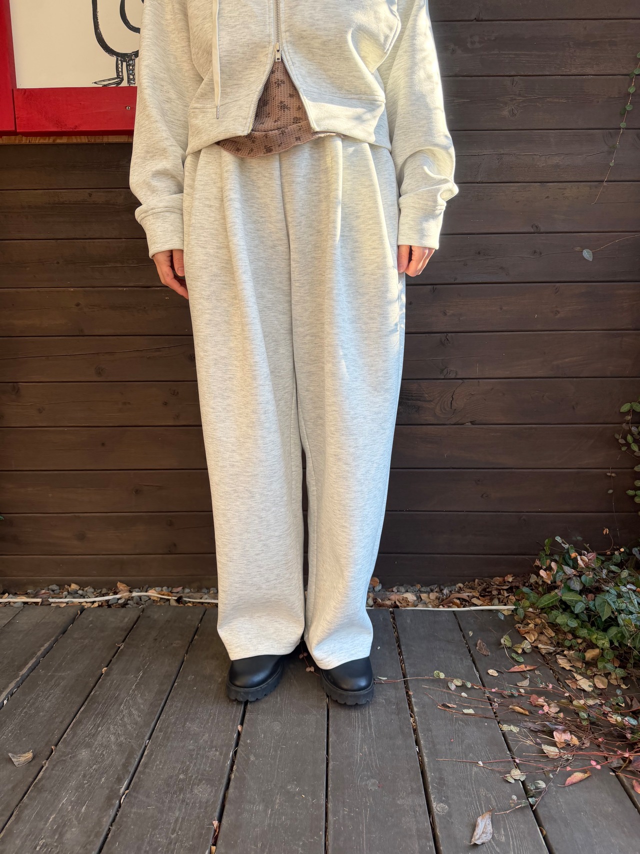 同素材のジップパーカーと合わせれば、統一感のあるセットアップスタイルが完成します