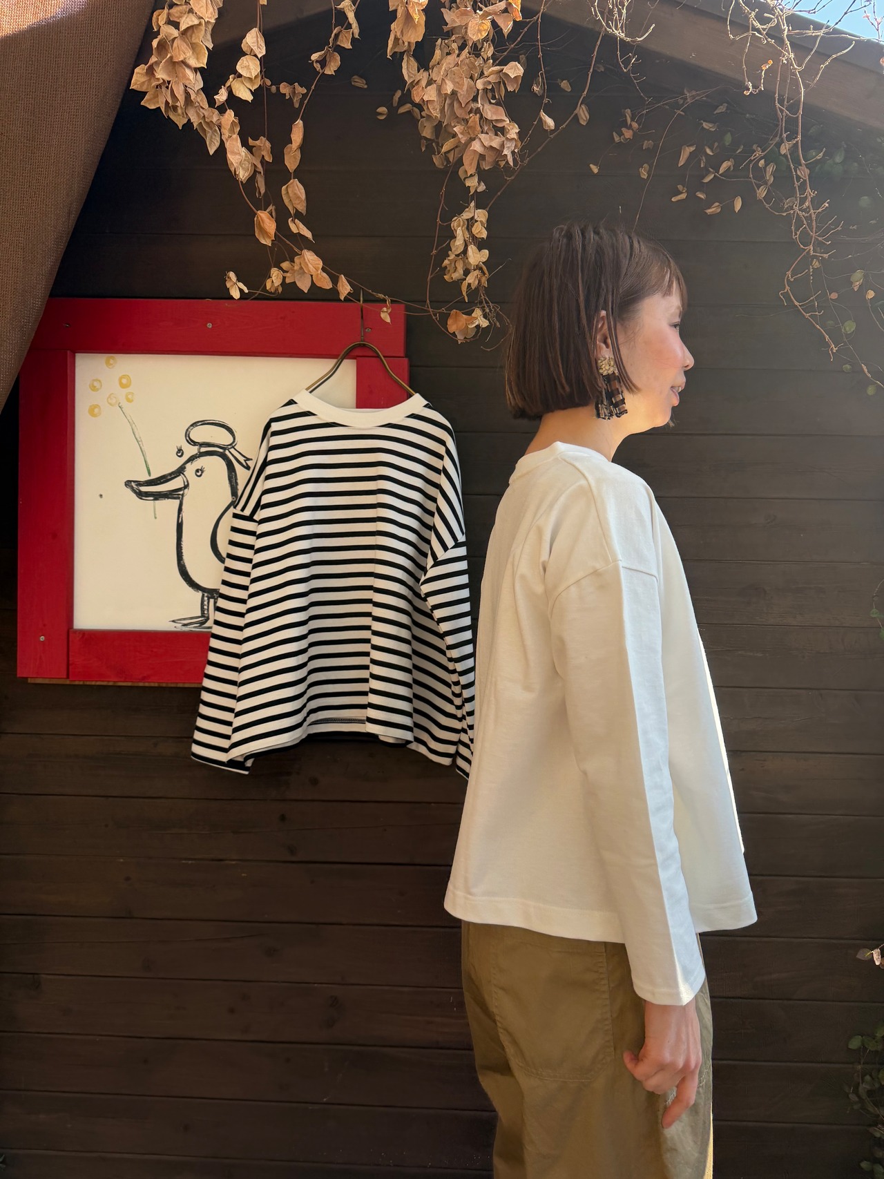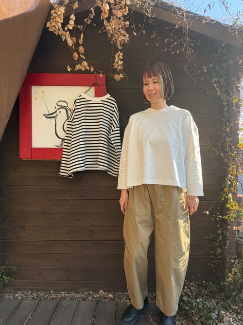 今期らしい短めトップス細めの袖とのコントラストで細みえ効果も◎