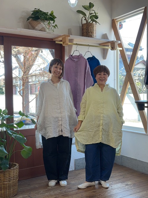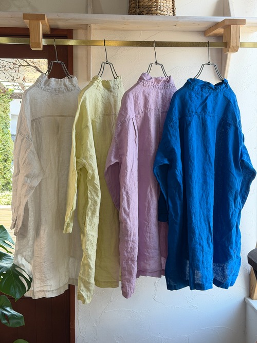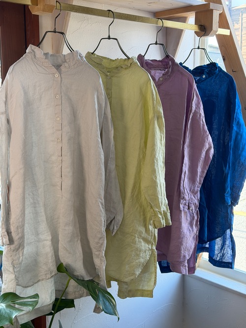 リネン100%日本製品染めのスタンドカラーチュニックシャツ